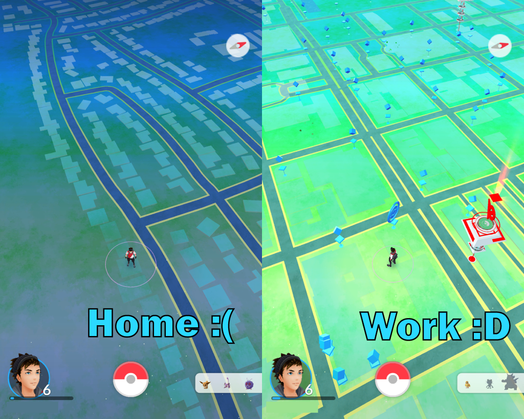 僕のデスクからは2つのポケストップ(アイテムを取得出来るポイント)が利用出来るし、たった1ブロック先にポケモンジムがあるんだ。
